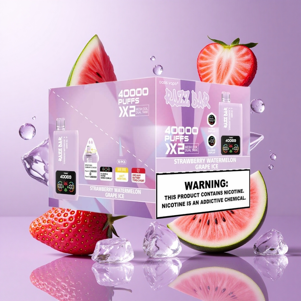 Razz Bar 40000パフ ディスポーザブルベイプ ストロベリーウォーターメロン_グレープアイス パワースクリーン表示 1.0オーム 2メッシュコイル